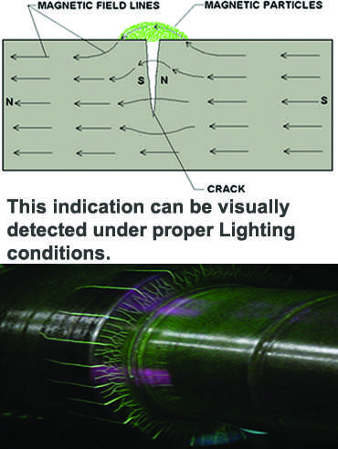 The part is magnetized. Finely milled iron particles coated with a dye pigment are then applied to the specimen. These particles are attracted to magnetic flux leakage fields and will cluster to form an indication directly over the discontinuity.