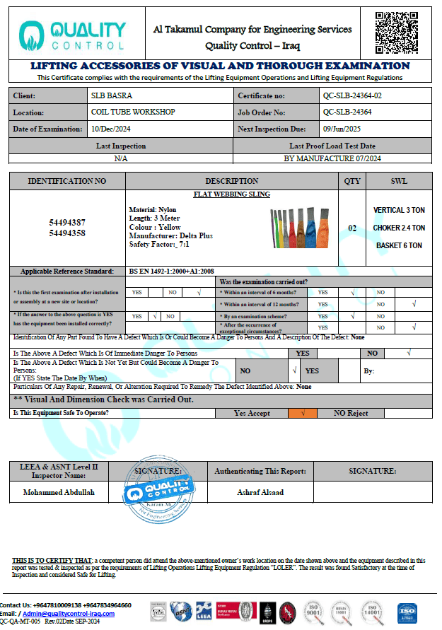 SLB BASRA COL TUBE WORKSHOP CERTIFICATE NO QC-SLB-24364-02 INSPECTION DATE 10/DEC/2024 DUE DATE 09/JUN/2025
