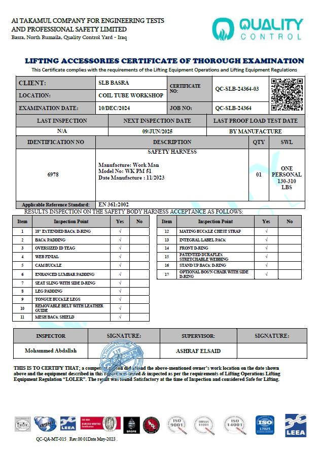 SLB BASRA COL TUBE WORKSHOP CERTIFICATE NO QC-SLB-24364-03 INSPECTION DATE 10/DEC/2024 DUE DATE 09/JUN/2025