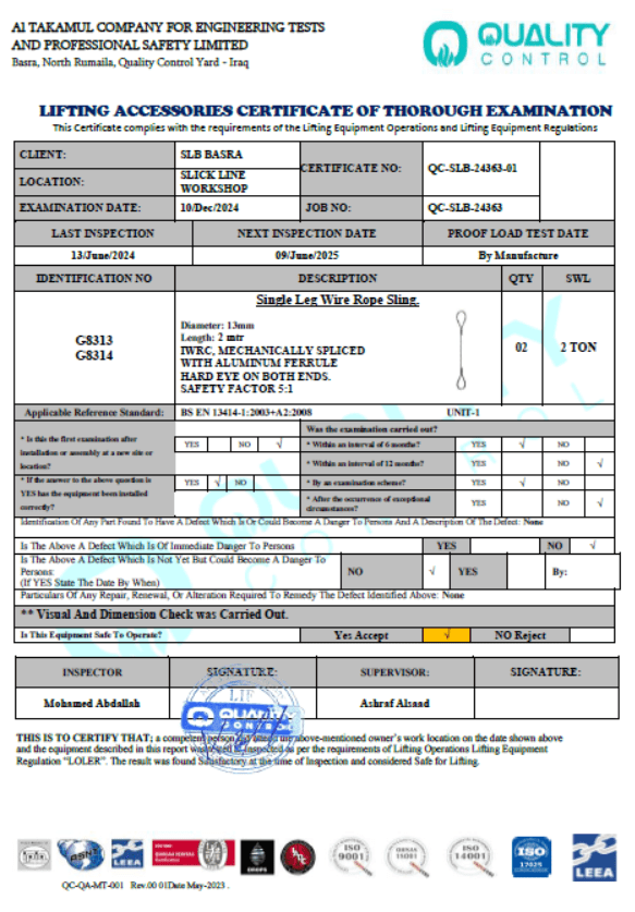 SLB BASRA SLICKLINE CERTIFICATE NO QC-SLB-24363-01 DATE OF INSPECTION 10-DEC-2024 DUE DATE 09-JUN-2025