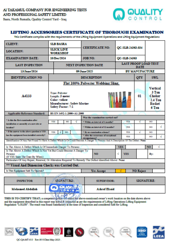 SLB BASRA SLICKLINE CERTIFICATE NO QC-SLB-24363-034 DATE OF INSPECTION 10-DEC-2024 DUE DATE 09-JUN-2025