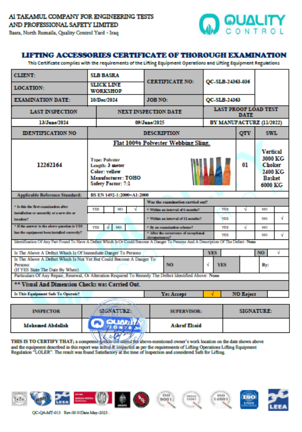 SLB BASRA SLICKLINE CERTIFICATE NO QC-SLB-24363-036 DATE OF INSPECTION 10-DEC-2024 DUE DATE 09-JUN-2025