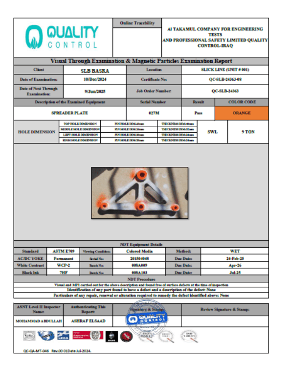 SLB BASRA SLICKLINE CERTIFICATE NO QC-SLB-24363-08 DATE OF INSPECTION 10-DEC-2024 DUE DATE 09-JUN-2025