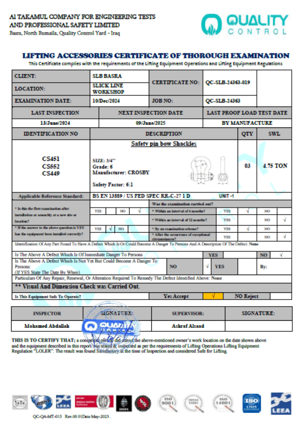 SLB BASRA SLICKLINE CERTIFICATE NO QC-SLB-24363-19 DATE OF INSPECTION 10-DEC-2024 DUE DATE 09-JUN-2025