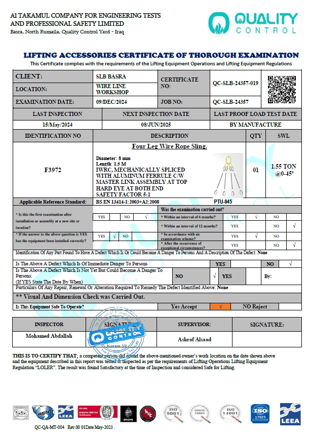 SLB BASRA WIRE LINE WORKSHOP CERTIFICATE NO QC-SLB-24357-019 INSPECTION DATE 09/DEC/2024 DUE DATE 08/JUN/2025