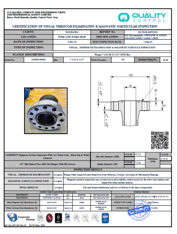 SLB BASRA WIRELINE CERTIFICATE NO QC-SLB-24359-014 DATE OF INSPECTION 02-DEC-2024 DUE DATE 01-JUN-2025