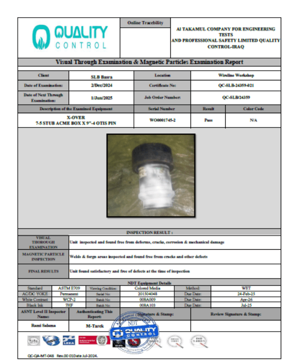 SLB BASRA WIRELINE CERTIFICATE NO QC-SLB-24359-021 DATE OF INSPECTION 02-DEC-2024 DUE DATE 01-JUN-2025