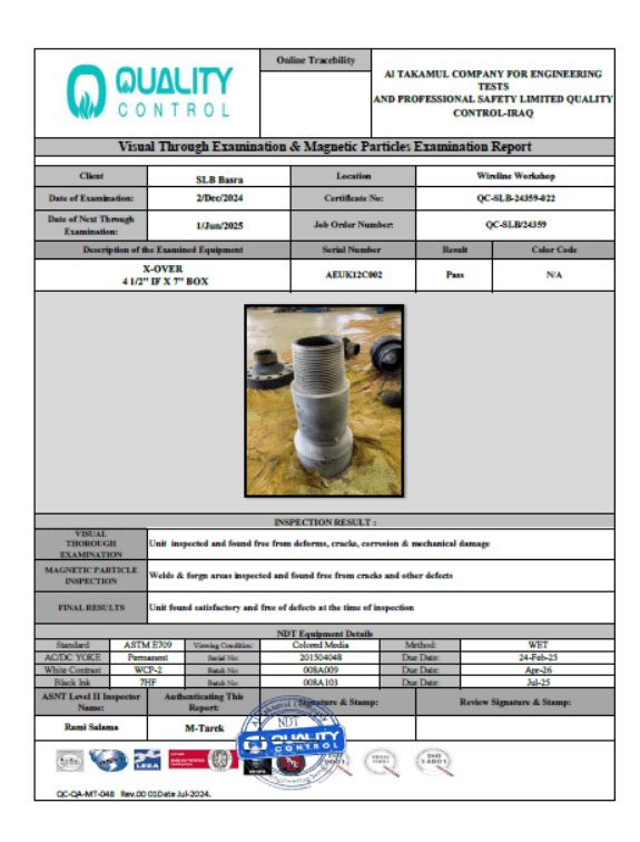 SLB BASRA WIRELINE CERTIFICATE NO QC-SLB-24359-022 DATE OF INSPECTION 02-DEC-2024 DUE DATE 01-JUN-2025
