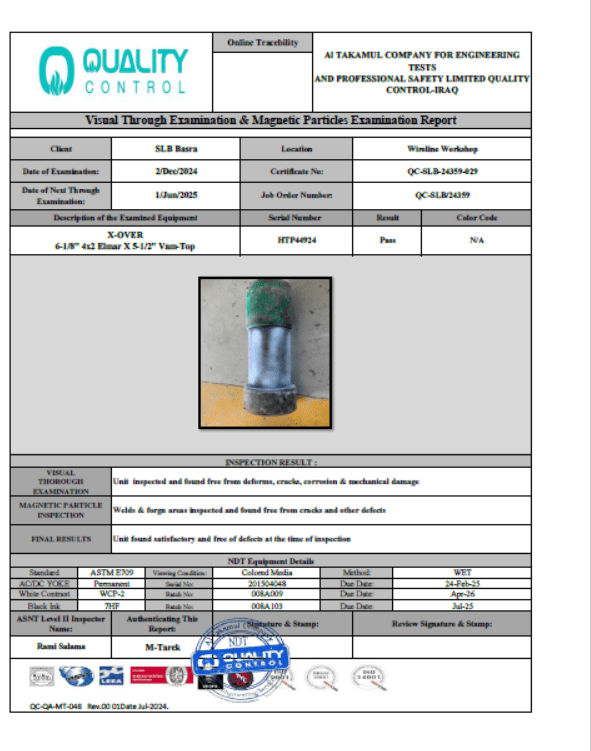 SLB BASRA WIRELINE CERTIFICATE NO QC-SLB-24359-029 DATE OF INSPECTION 02-DEC-2024 DUE DATE 01-JUN-2025