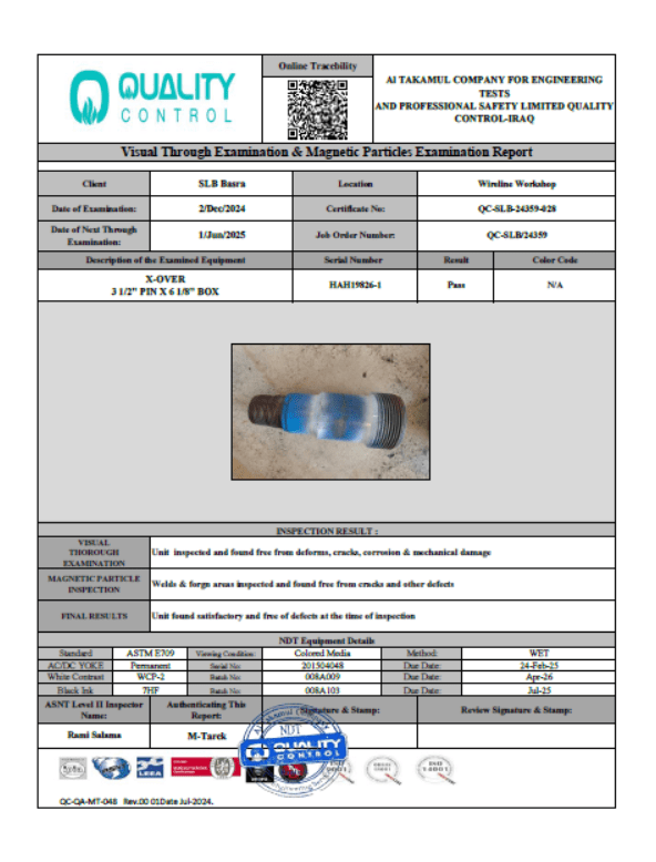 SLB BASRA WIRELINE CERTIFICATE NO QC-SLB-24359-029 DATE OF INSPECTION 02-DEC-2024 DUE DATE 01-JUN-2025