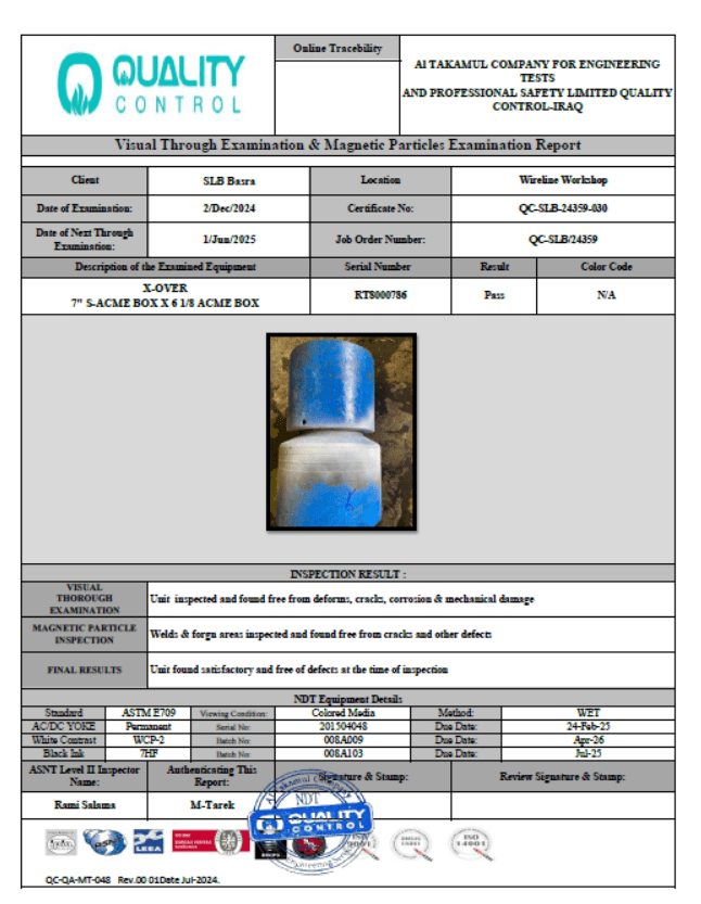 SLB BASRA WIRELINE CERTIFICATE NO QC-SLB-24359-030 DATE OF INSPECTION 02-DEC-2024 DUE DATE 01-JUN-2025
