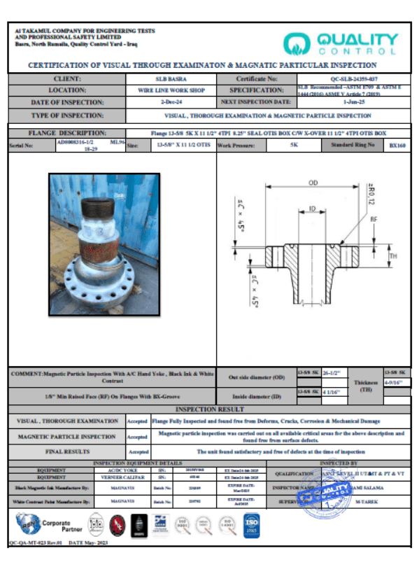 SLB BASRA WIRELINE CERTIFICATE NO QC-SLB-24359-037 DATE OF INSPECTION 02-DEC-2024 DUE DATE 01-JUN-2025